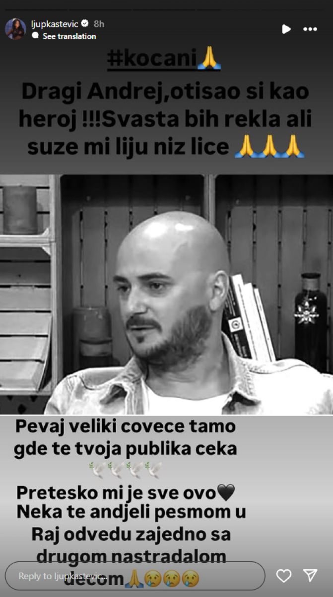– Драг Андреј, си замина како херој! Би кажала се, но солзи ми течат по лицето. Пеј, голем човеку, каде што те чека публиката. Сето ова ми е премногу тешко. Нека ангелите те одведат во рајот со песна, заедно со другите деца кои починаа“, напиша таа.