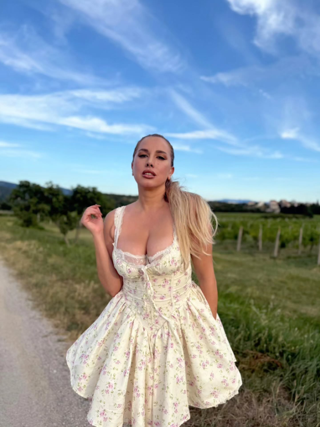 Нивес, позираше во краток фустан меѓу гроздовите, додека нејзините бујни, природни облини беа во прв план.