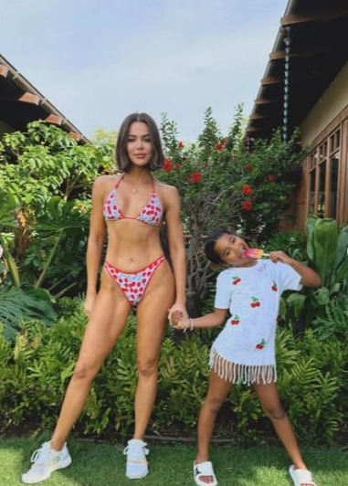 Ријалити ѕвездата, која има 40 години и повеќе од 300 милиони следбеници, позираше во костим за капење со црвен детаљ и мотив од цреша, заедно со нејзината ќерка Тру и синот Тејтум.