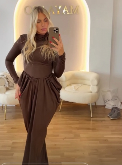 Позната по својот совршен физички изглед, таа сега позираше во елегантен кафеав фустан со набори на колковите, што предизвика вистинска лавина комплименти од нејзините следбеници.