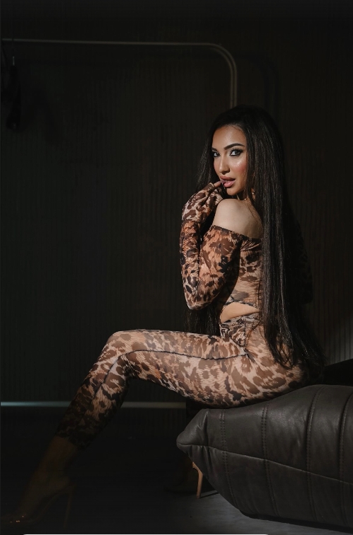 Овој пат облечена во тесно припиен комбинезон кој пука на неа и ја отцртува секоја нејзина облина, распеаната убавица изгледа како расна тигрица.
