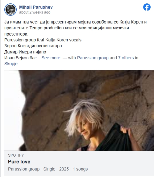Групата „Парусион“ на македонскиот тапанар и перкусионист Михаил Парушев ја издаде новата песна со наслов „Чиста љубов“ (Pure Love), на која како вокал гостува Катја Корен, пејачка од Словенија која живее во САД.