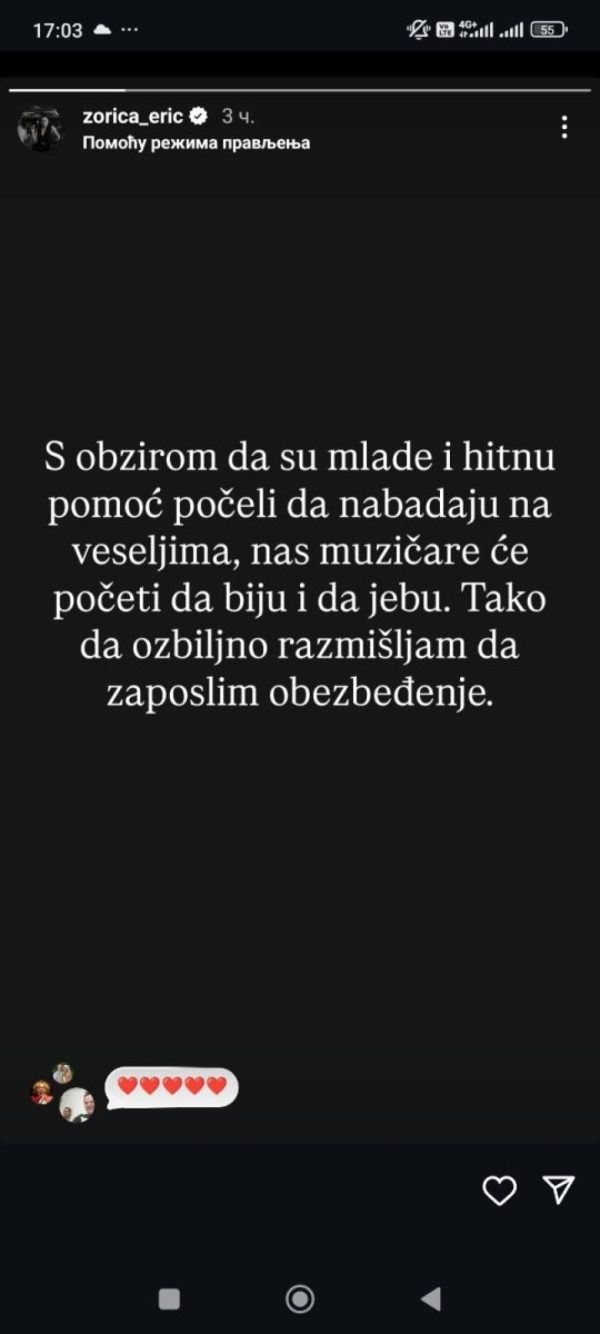 Пејачката Зорица Ериќ на Инстаграм се огласи за инцидентот, нагласувајќи дека сè отишло во крајности и дека ќе биде принудена да ангажира обезбедување.