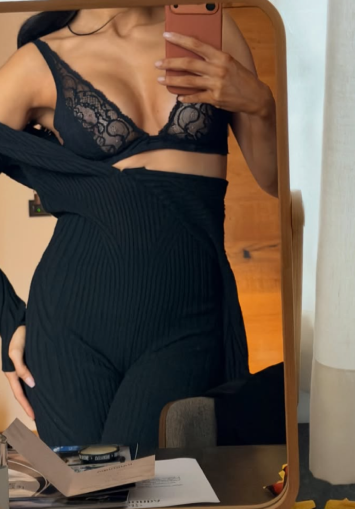 Нејзиното деколте беше во преден план, додека комбинезонот беше спуштен, па Едита остана во црн градник од тантела.
