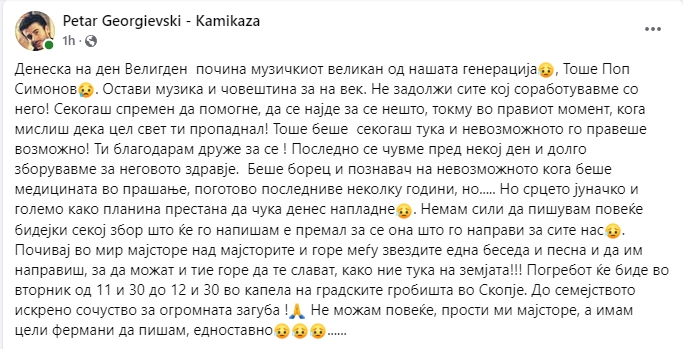 „Денеска на ден Велигден почина музичкиот великан од нашата генерација, Тоше Поп Симонов. Остави музика и човештина за на век. Не задолжи сите кој соработувавме со него! Секогаш спремен да помогне, да се најде за се нешто, токму во правиот момент, кога мислиш дека цел свет ти пропаднал! Тоше беше секогаш тука и невозможното го правеше возможно! Ти благодарам друже за се ! Последно се чувме пред некој ден и долго зборувавме за неговото здравје. Беше борец и познавач на невозможното кога беше медицината во прашање, поготово последниве неколку години, но….. Но срцето јуначко и големо како планина престана да чука денес напладне. Немам сили да пишувам повеќе бидејки секој збор што ќе го напишам е премал за се она што го направи за сите нас. Почивај во мир мајсторе над мајсторите и горе меѓу звездите една беседа и песна и да им направиш, за да можат и тие горе да те слават, како ние тука на земјата!!! Погребот ќе биде во вторник од 11 и 30 до 12 и 30 во капела на градските гробишта во Скопје. До семејството искрено сочуство за огромната загуба ! Не можам повеќе, прости ми мајсторе, а имам цели фермани да пишам, едноставно…“ – со солзи во очите се прости Перо Камиказа од својот долгогодишен сорабитник и близок пријател.