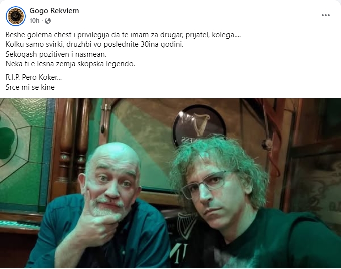 „Беше голема чест и привилегија да те имам за другар, пријател, колега… Колку свирки, дружби во последните 30-ина години.Секогаш позитивен и насмеан.Нека ти е лесна земја скопска, легендо. Почивај во мир Перо Кокер… Срце ми се кине“ – споделил тој на неговиот ФБ покрај заедничката фотографија со починатиот колега