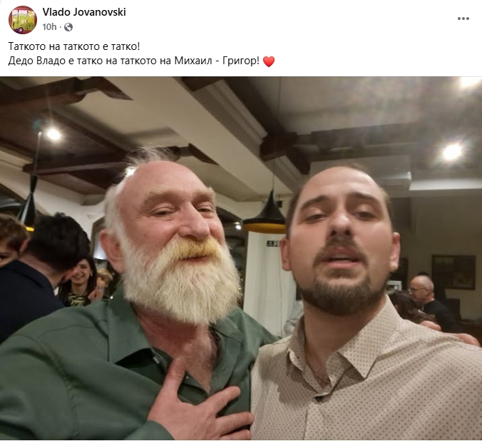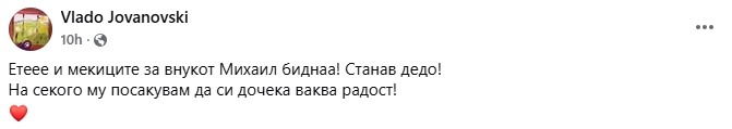 „Ете и мекиците за внукот Михаил биднаа! Станав дедо! На секого му посакувам да си дочека ваква радост“ – споделил актерот и голем македонски патриот Владо Јовановски на својот Фејсбук профил.