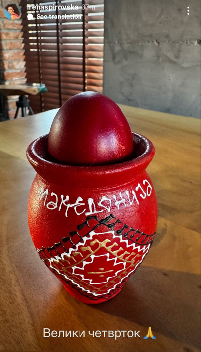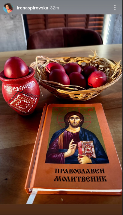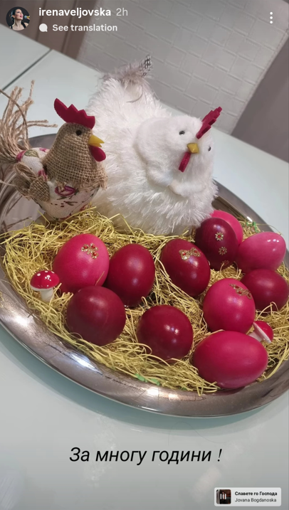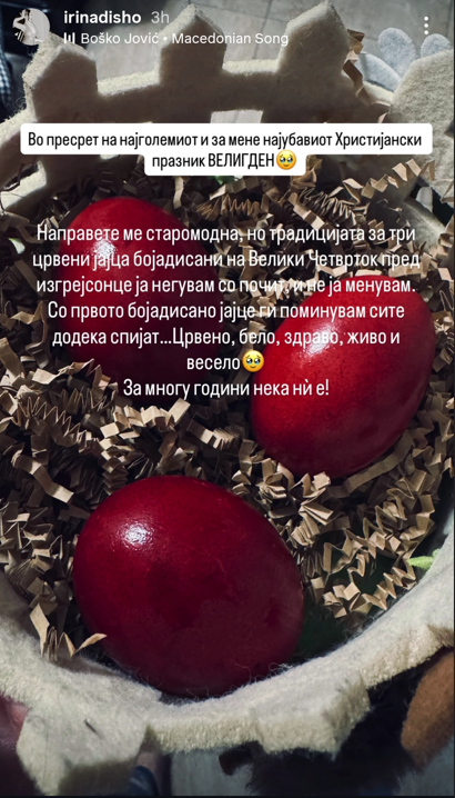 Ирина Дишо – Направете ме старомодна, но традицјата за три црвени јајца бојадисани на Велики Четврток пред изгрејсонце ја негувам со почит и не ја менувам. Со првото бојадисано јајце ги поминувам сите додека спијат. Црвено бело здраво живо и весело! За многу години нека ни е !