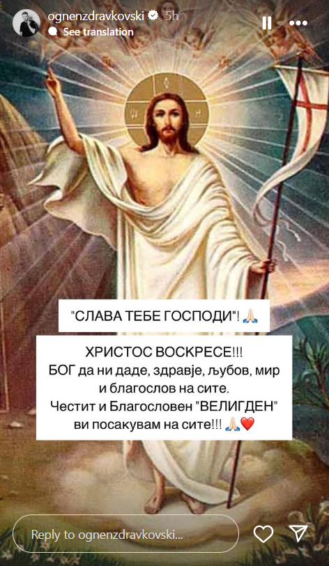 – Слава тебе Господи! Христос Воскресна! Бог да ни даде, здравје, љубов, мир и благослов на сите. Честит и Благословен Велигден ви поскаувам на сите!