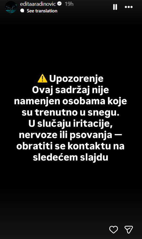 „Предупредување! Оваа содржина не е наменета за луѓе кои моментално се наоѓаат на снег. Во случај на иритација, нервоза или пцуење, ве молиме контактирајте го контактот на следниот пост“, напиша Едита Арадиновиќ.