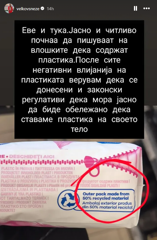 Имено, Снеже Велков тврди дека за прв пат на веков видела дека на пакувањео на хигиенски влошки отворено да пишува дека содржат пластика! На истите оние кои понежниот пол најмногу и најчесто ги користи во моментите кога во месецот ќе им дојдат „оние денови“ за давање „данок во крв“ на природата.