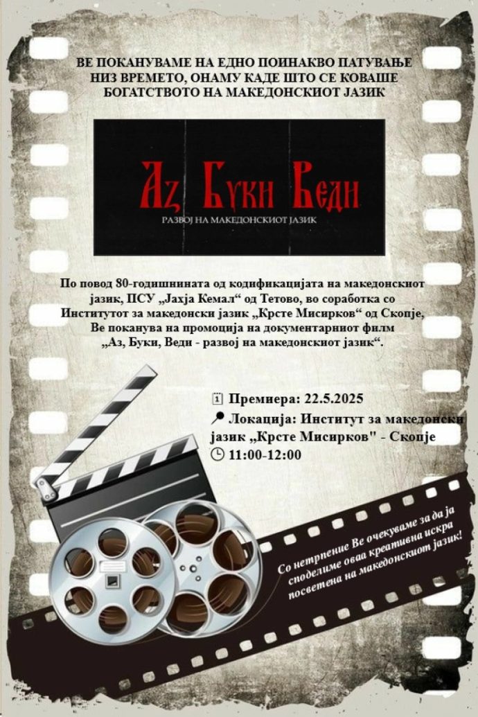 Документарниот филм „Аз, Буки, Веди – развој на македонскиот јазик“ ќе биде промовиран денеска во Институтот за македонски јазик „Крсте Мисирков“ по повод 80-годишнината од кодификацијата на македонскиот јазик.