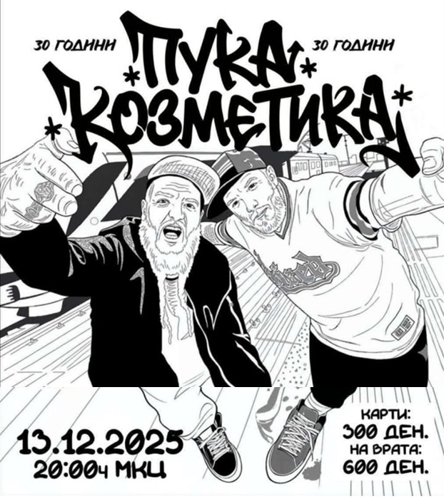Во сабота во МКЦ со почеток од 20:00 часот започнува роденденот на пионерите на македонскиот рап Пука Козметика. Во киното Фросина приказната на групата ќе биде раскажана по што следува промоција на нивната прва винил плоча, за да настанот кулминира во денсинг салата со многу гости рапери и секако концерт на Пука Козметика. Тие пред неколку дена го пуштија својот нов сингл и видео спот за песната Рап ветерани.