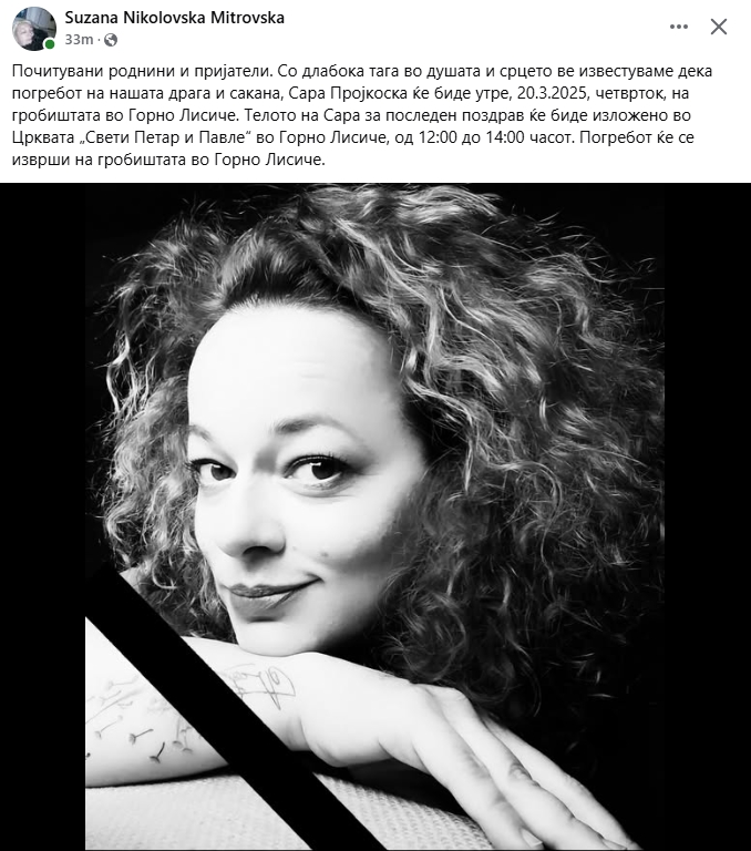 Телото на Сара за последен поздрав ќе биде изложено во Црквата „Свети Петар и Павле“ во Горно Лисиче, во четврток на 20.03.2025 година, од 12:00 до 14:00 часот. Погребот ќе се изврши на гробиштата во Горно Лисиче.