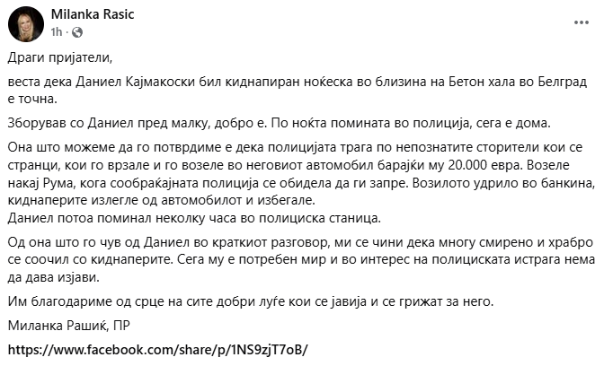„Зборував со Даниел пред малку, добро е. По ноќта помината во полиција, сега е дома. Она што можеме да го потврдиме е дека полицијата трага по непознатите сторители кои се странци, кои го врзале и го возеле во неговиот автомобил барајќи му 20.000 евра. Возеле накај Рума, кога сообраќајната полиција се обидела да ги запре. Возилото удрило во банкина, киднаперите излегле од автомобилот и избегале“, пишува во првиот дел од соопштението.