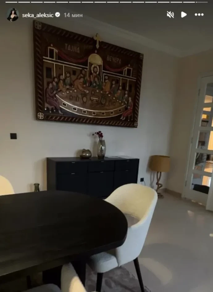 Алексиќ ја фотографирала големата маса и столчиња, додека на ѕидовите можат да се видат бројни икони, а на најголемиот дел од ѕидот е поставена сликата „Тајната вечера“.