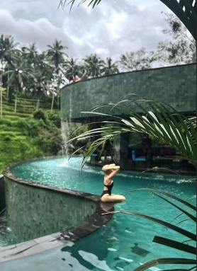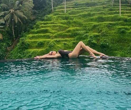 Таа максимално го искористи своето време за да ужива, а сега покажа како плива на дожд, што воопшто не и пречеше, а потоа позираше на работ од базенот во едноделен костим за капење кој одлично ги истакна нејзините облини.