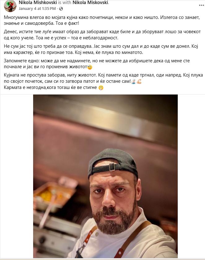 Но, со последната објава на својот Фејсбук профил, шеф Никола Мишковски недвојбено покажа дека некој се обидува нему да му го урне авторитетот. И тоа очигледно нему блиски луѓе или барем некогаш тоа му биле, кога кај него, во неговата кујна почнувале да стануваат некои и нешто во готвачкиот занает, многумина дури почнувајќи и од нула!