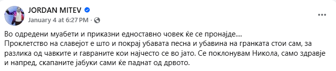 Арно ама, како што вели старата добра поговорка: „Каменот по глава доаѓа одблизу“, па така откако се почувствувале доволно „силни и способни“, се свртеле против него и… „Денес, истите тие луѓе имаат образ да заборават каде биле и да зборуваат лошо за човекот од кого учеле“ – како што меѓудругото посочува самиот Никола во својата предбожиќна Фејсбук исповед.