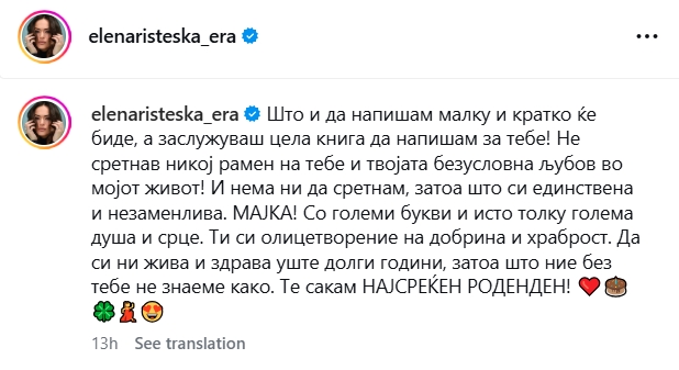 – Што и да напишам малку и кратко ќе биде, а заслужуваш цела книга да напишам за тебе! Не сретнав никој рамен на тебе и твојата безусловна љубов во мојот живот! И нема ни да сретнам, затоа што си единствена и незаменлива. Мајка! Со големи букви и исто толку голема душа и срце. Ти си олицетворение на добрина и храброст. Да си ни жива и здрава уште долги години, затоа што ние без тебе не знаеме како. Те сакам најсреќен роденден!