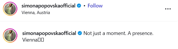 Пејачката и докторка дерматолог Симона Поповска предновогодишно отпатува во Виена, и оттаму  се огласи на социјалната мрежа Инстаграм.