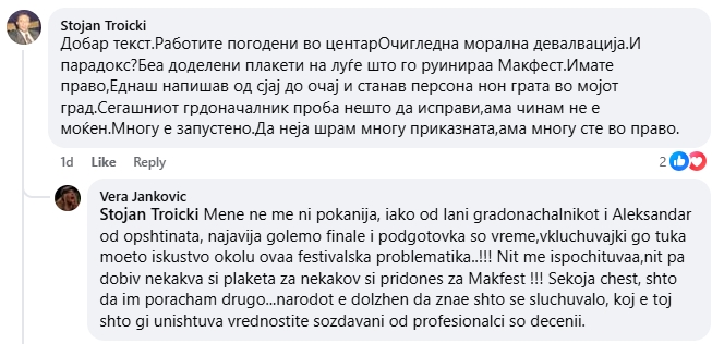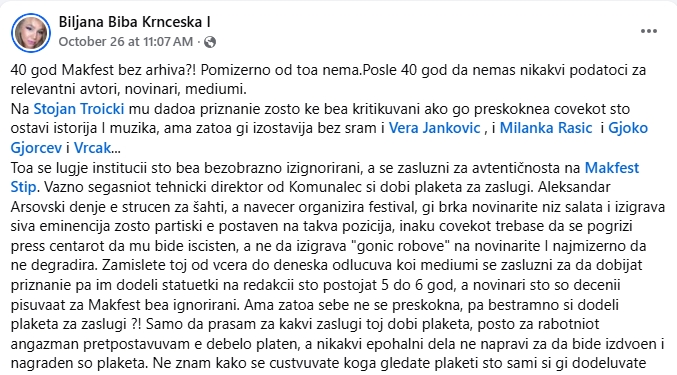 За мноштвото кои беа (не)намерно заборавени и изоставени – немаме зборови… А нема ниту оправдување за селективноста на доделувачите кои не изоставија да се наградат и самите себеси иако во Макфест се инволвирани едвај неколку години, додека оние кои ја градеа и создаваа фестивалската историја ги заборавија или премолчеа! Небаре Макфест е приватна сопственост, а не јавно културно добро. Општина Штип е организатор и стои зад фестивалот, ама зад пропустите стојат поединци со име и презиме. Прстот на сите вперен во едно лице – главниот продуцент на Макфест, Александар Арсовски.