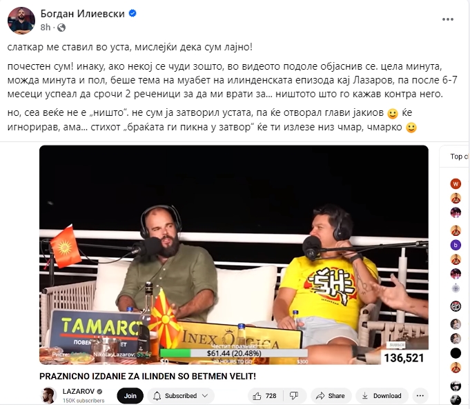 Почестен сум! Инаку, ако некој се чуди зошто, во видеото подоле објаснив се. Цела минута, можда минута и пол, беше тема на муабет на илинденската епизода кај Лазаров, па после 6-7 месеци успеал да срочи 2 реченици за да ми врати за… ништото што го кажав контра него. Но, сеа веќе не е „ништо“. Не сум ја затворил устата, па ќе отворал глави јакиов! Ќе игнорирав, ама… стихот „браќата ги пикна у затвор“ ќе ти излезе низ чмар, (ч)Марко“ – му порачал Бетмен возвраќајќи му со закана дека нема туку така преку овие навреди и обвинувања да помине.