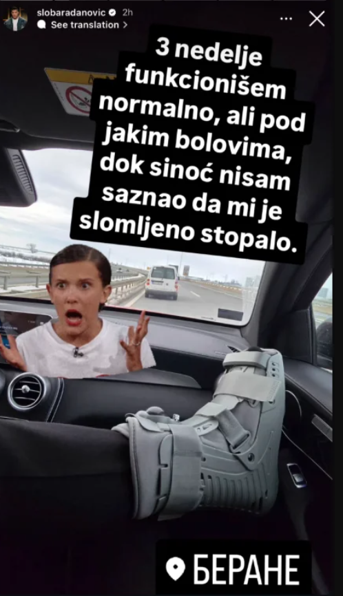 – Три недели функционирам нормално, но со силни болки, сè додека синоќа не дознав дека ми е скршена ногата, а не се сеќавам кога или како ја скршив – напиша Слоба Радановиќ, додавајќи: