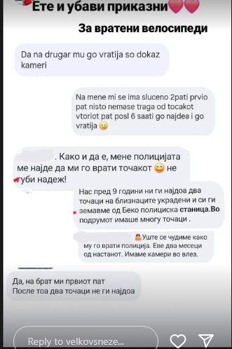 Како што појаснува Снеже кражбата се случила среде бел ден од центарот на Скопје, по што кражбата била пријавела во полиција и тоа со снимки од видео надзор.