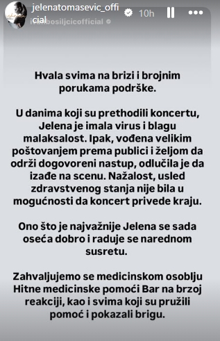Сакаме да им се заблагодариме на медицинскиот персонал на Службата за итна медицинска помош во Бар за нивната брза реакција, како и на сите што пружија помош и покажаа грижа, стои во соопштението објавено на Инстаграм.