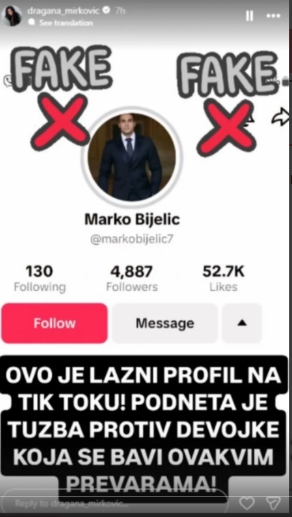 Пејачката се огласи и објасни дека профилот на социјалната мрежа „TikTok“ што го носи името на Марко нема никаква врска со него.