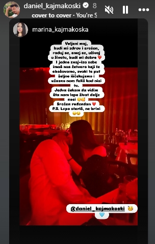-Сакан мој, биди ми здрав и среќен, радувај се, смеј се, уживај во животот, биди ми добро и едно знај – зад себе не имаш нас четворица кои те обожаваме, секојпат желно те чекаме и ужасно ни фалиш кога не си тука. Едвај чекам да видам што убаво животот ќе ни донесе. Среќен роденден. п.с Убаво старееш, не се грижи!- му напиѓа Марина на сопругот.