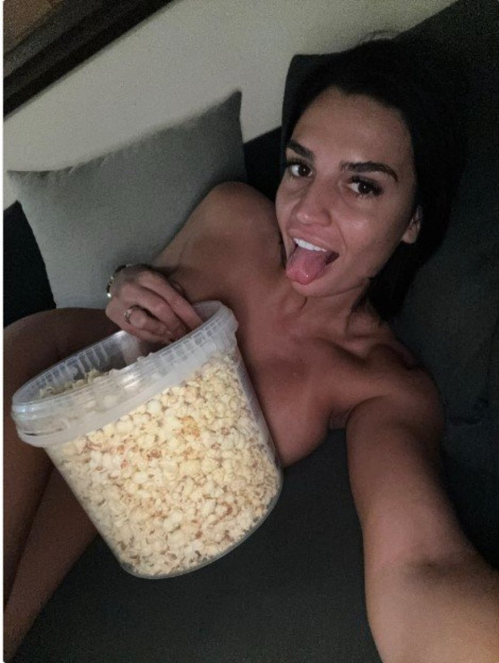 Бојаниќ удобно се смести во кревет, сосема гола, и ги покри интимните делови со големо пакување пуканки.