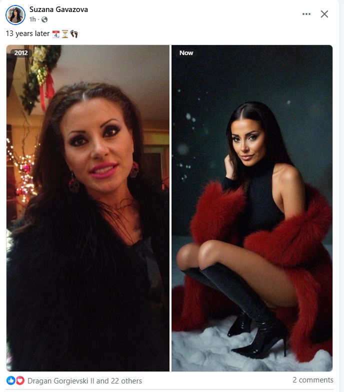 Компарацијата што самата фолкерка си ја направила споредувајќи ги двете фотографии укажува на следното: Во ликот непроменета, во стилот помодерна, а во сексапилот разликата е евидентна од одма – Сузана Гавазова е „еротска бомба“!
