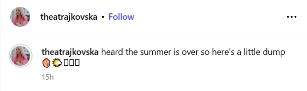 На фотографиите кои ги објави, пејачката зрачи со самодоверба и свежина, а покрај нив ги напиша и зборовите: „Слушнав дека летото заврши, па еве малку спомени“.