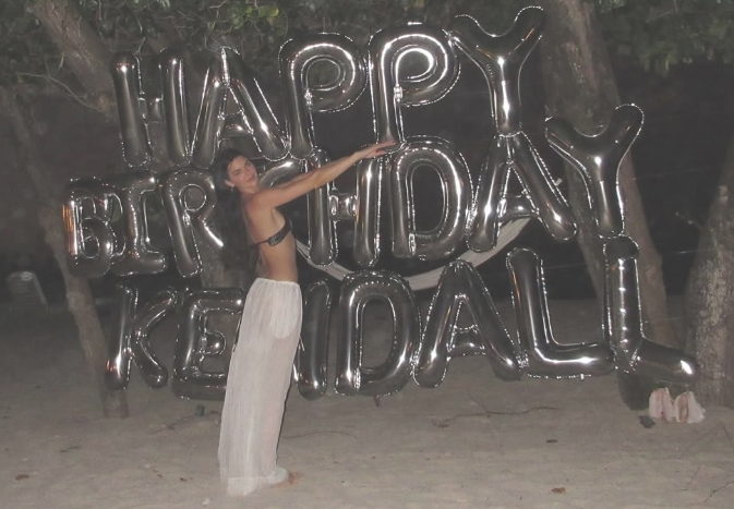 без ограничувања Славната манекенка го слави 30-от роденден пиштол гола на остров со песок како кашмир
