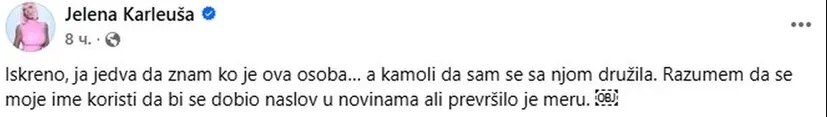 – Искрено, едвај знам кој е оваа личност… а камоли дека порано се дружев со неа. Разбирам дека моето име се користи за да се добие наслов во медиумите, но отиде предалеку – напиша Јелена Карлеуша на социјалната мрежа Фејсбук.