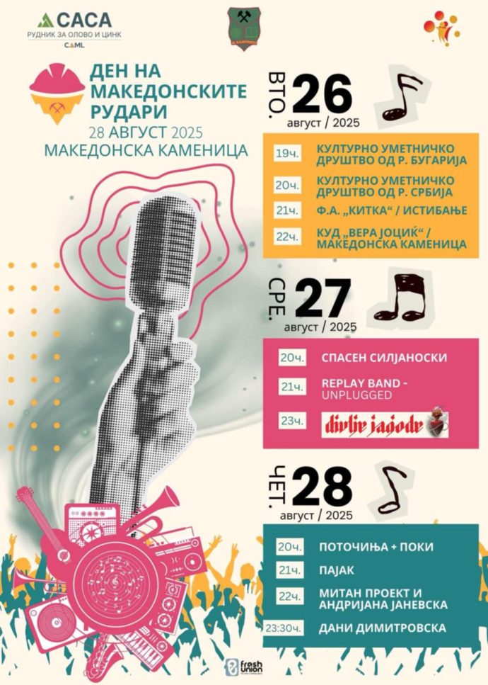 Втората вечер – Рок енергија (среда, 27 август 2025) Публиката ја очекува вистинска експлозија од емоции и добро познати звуци: • Спасен Силјаноски – глас кој носи топлина и традиција. REPLAY BAND – Unplugged со хитови во ново светло. Легендарните Дивље јагоде, со рок енергија што со децении ја полни балканската сцена. Големото финале – Денот на рударите (четврток, 28 август 2025) во 20 часот вечерта ќе ја отворат најмладите – хорот „Поточиња“ и нивниот Поки. Забавата потоа продолжува со: ДЈ Пајак – со сет што ќе ја подигне енергијата, Митан проект и Андијана Јаневска – совршен спој на традиција и современост, обоен со нејзиниот магичен глас и за крај – рокерката Дани Димитровска, чиј моќен вокал ќе биде вистинска круна на прославата. Македонска Каменица повторно ќе пулсира како град на културата, забавата и заедништвото.