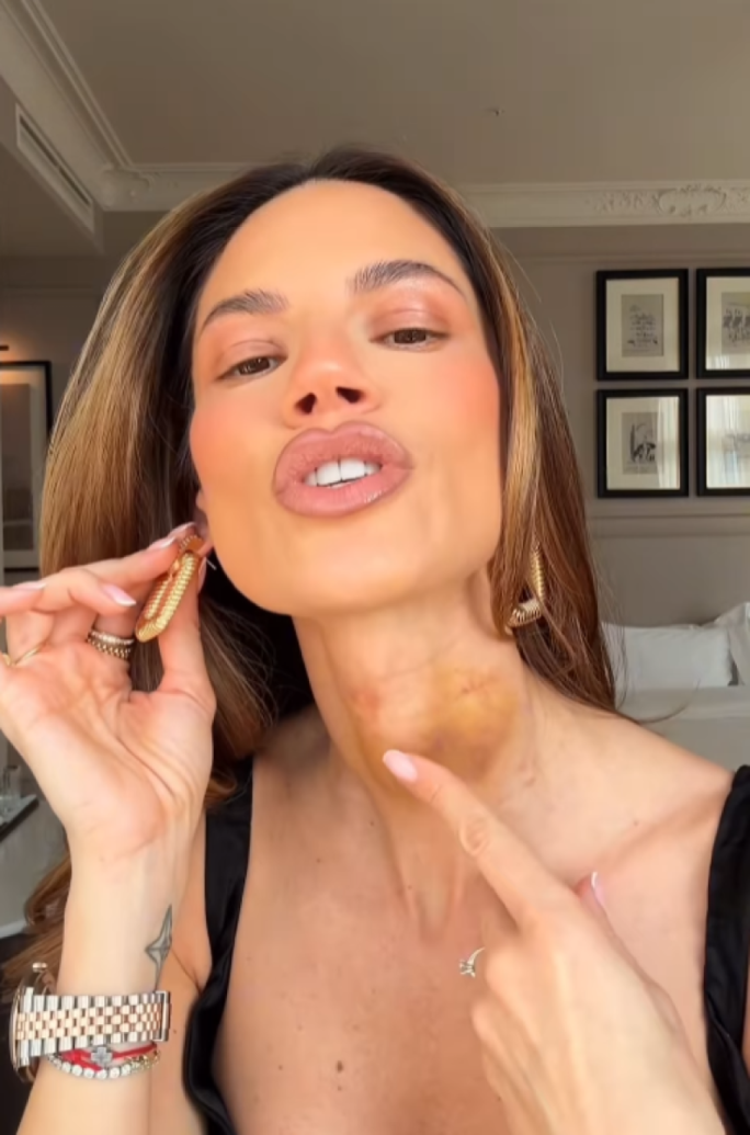 На крајот, таа се пошегува дека модринките и хематомите што ги има од третманот на вратот се уште еден златен моден детаљ.