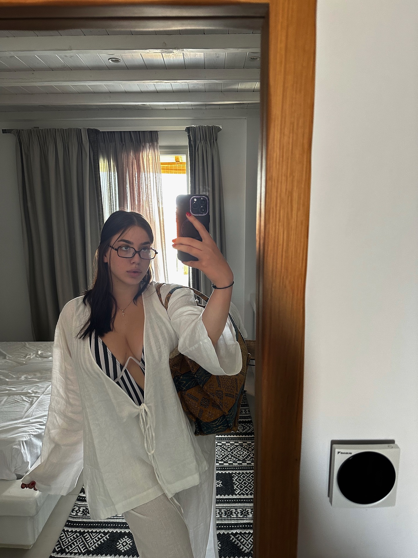На една слика таа позира во луксузен автомобил, со лежерно спуштени ремени, додека на друга слика е прикажан опуштен летен фустан од тоалет, во фустан дизајниран за прошетка покрај брегот.
