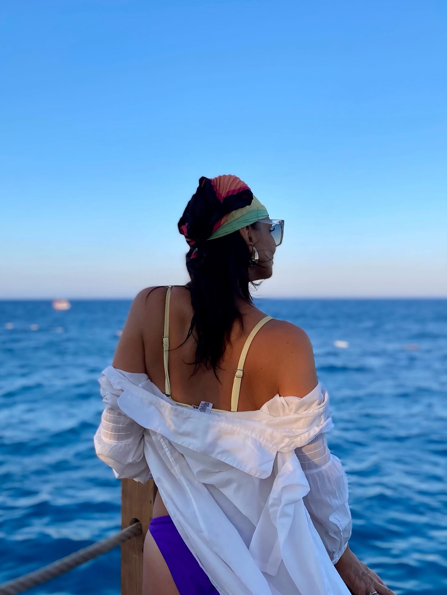 Деталите кои ги носеше беа внимателно одбрани и совршено усогласени – очила за сонце што дадоа нежен шмек, бела кошула која го нагласуваше нејзиниот природен  сјај и марама на главата во лагодни летни бои, кои го надополнуваа нејзиниот безвременски стил.
