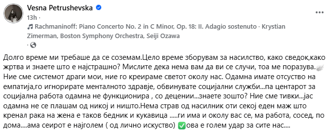 По трагедијата во скопски Карпош која никого не остави рамнодушен, откако мајка со својата малолетна ќеркичкаа, по години голгота, малтретирање и брутално семејно насилство си го одземаа животот на најстрашен начин, јавноста одново експлодираше. Медиумите бруеја, социјалните мрежи „зовреа“, сите некако вперувајќи го прстот во системот. А всушност системот не постои сам по себе, зашто системот сме сите ние. На него за жал, се сеќаваме само откако ќе се случи некаква трагедија. Тогаш сите сме најгласни, сите паметуваат и мудруваат, плукаат, обвинуваат, критикуваат… Да, така е, ама сепак – не е така! Зашто предоцна е да се дели ум и бараат виновници откако некој на некого или сам на себе ќе крене рака.